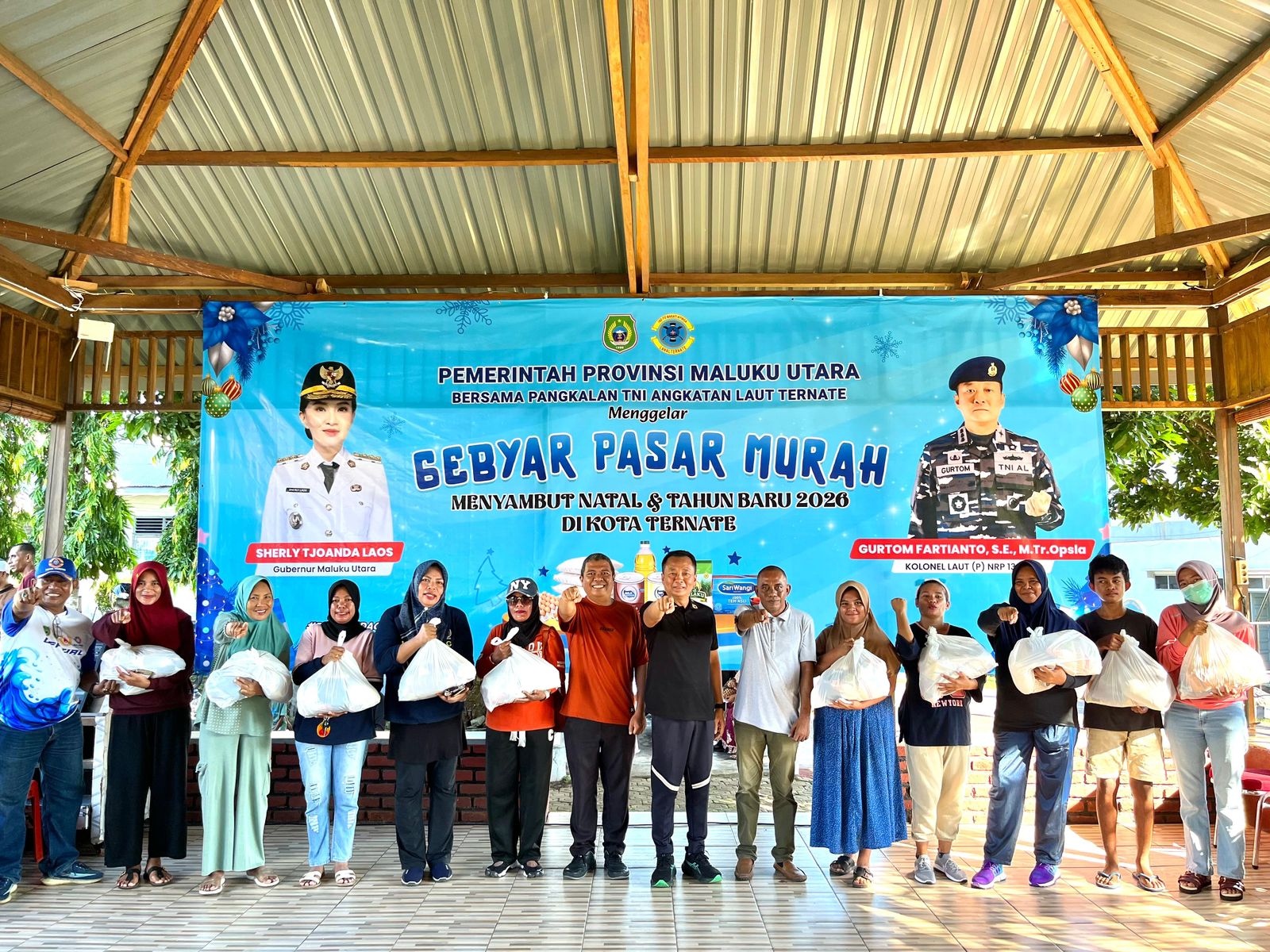 TERNATE, SerambiTimur – Suasana penuh kebahagiaan mewarnai Markas Komando Pangkalan TNI AL (Mako Lanal) Ternate pada Minggu (21/12/2026). Sebanyak 1.000 paket sembako disalurkan kepada masyarakat melalui kegiatan Gebyar Pasar Murah hasil kolaborasi Lanal Ternate dan Pemerintah Provinsi Maluku Utara dalam rangka menyambut Natal dan Tahun Baru (Nataru) 2026.