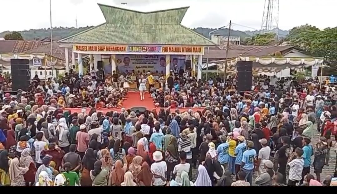 Halmahera Selatan, SerambiTimur- Ribuan pendukung memenuhi Lapangan Samargalila, Halmahera Selatan, untuk menghadiri kampanye akbar pasangan calon Gubernur dan Wakil Gubernur Maluku Utara nomor urut 2, H. Aliong Mus-Sahril Tahir, pada Minggu (27/9/2024). Yel-yel kemenangan dan doa optimisme mengiringi acara ini dari awal hingga akhir.