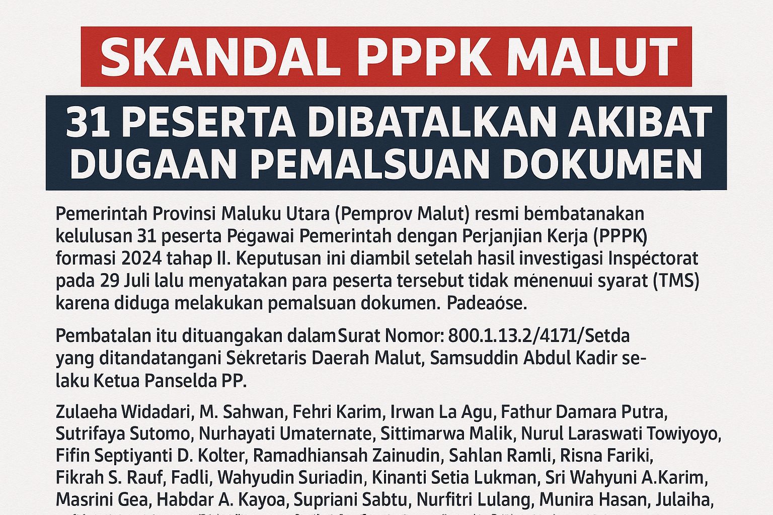 Pembatalan dilakukan setelah hasil investigasi Inspektorat menyatakan 31 peserta tersebut tidak memenuhi syarat (TMS) karena diduga menggunakan dokumen palsu dan tidak pernah tercatat sebagai honorer Pemprov Malut.
